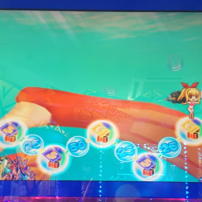 最初空いてる席で海をやってたら、おっちゃんは何やら他のゲームをやりたくなったらしく、「こっちのオレで席やらないか?」と言われて移動しました。見るとウェーブルーレットまであと2個、しかもすごろくが残り3マスという状態。