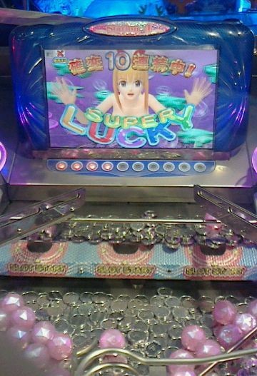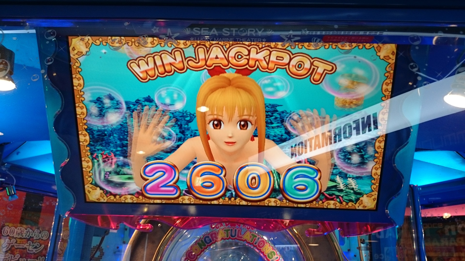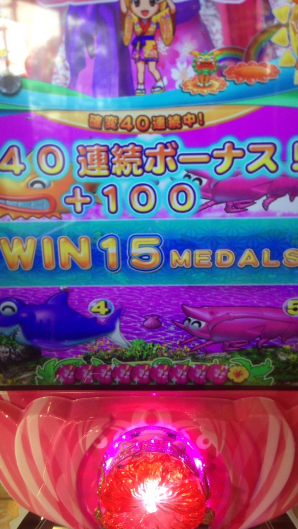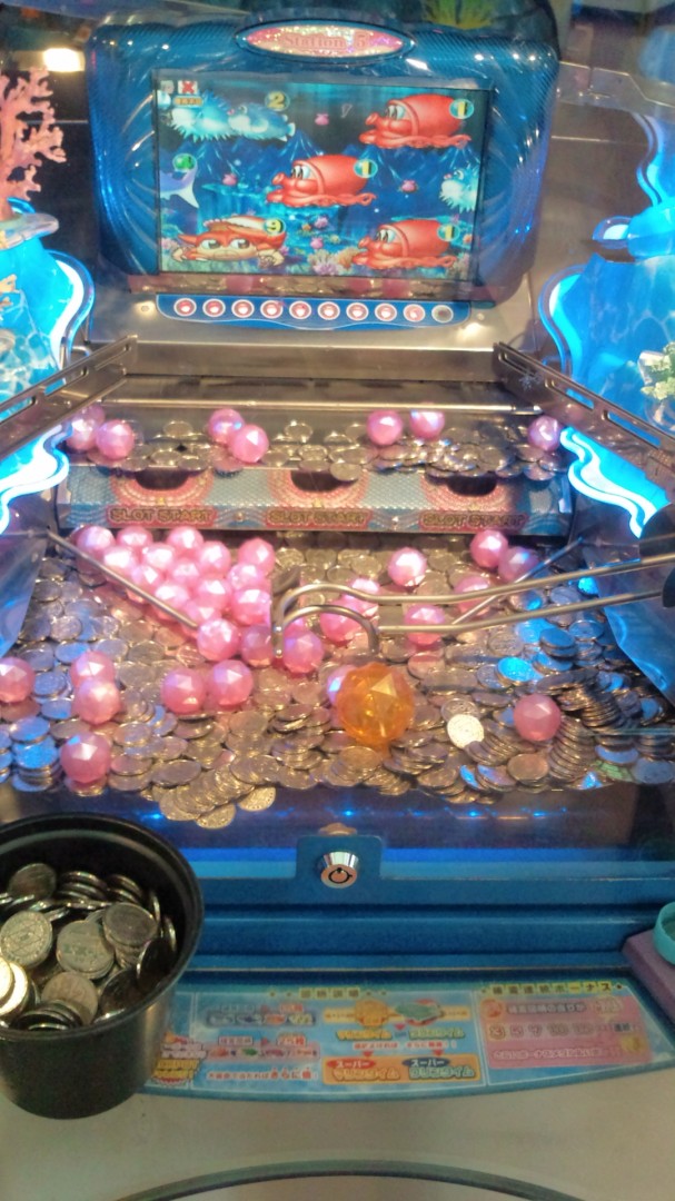 先日久々にラッキーチャンスになって、これまた久々にスーパーマリンタイムになったので、4回ぐらい(800枚)を期待していたら、ラッキーなことに6回まで行き、これは初のパーフェクトかと期待したら最後はあっさりはずれました。でも、1200枚は、そのときのJP枚数の1100枚よりも多かったし、横からの払い出しなので無駄につもることもなく、かなり効率的にメダルが落ちてきたので嬉しかったです。次こそはパーフェクトを出したいものです。