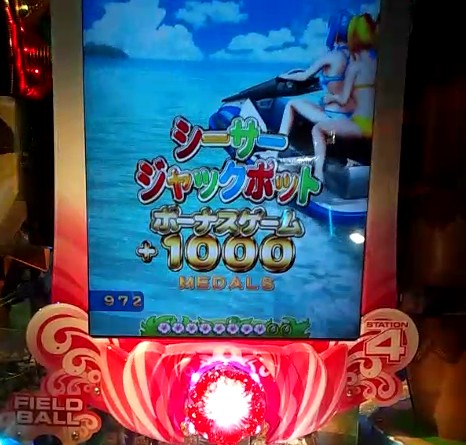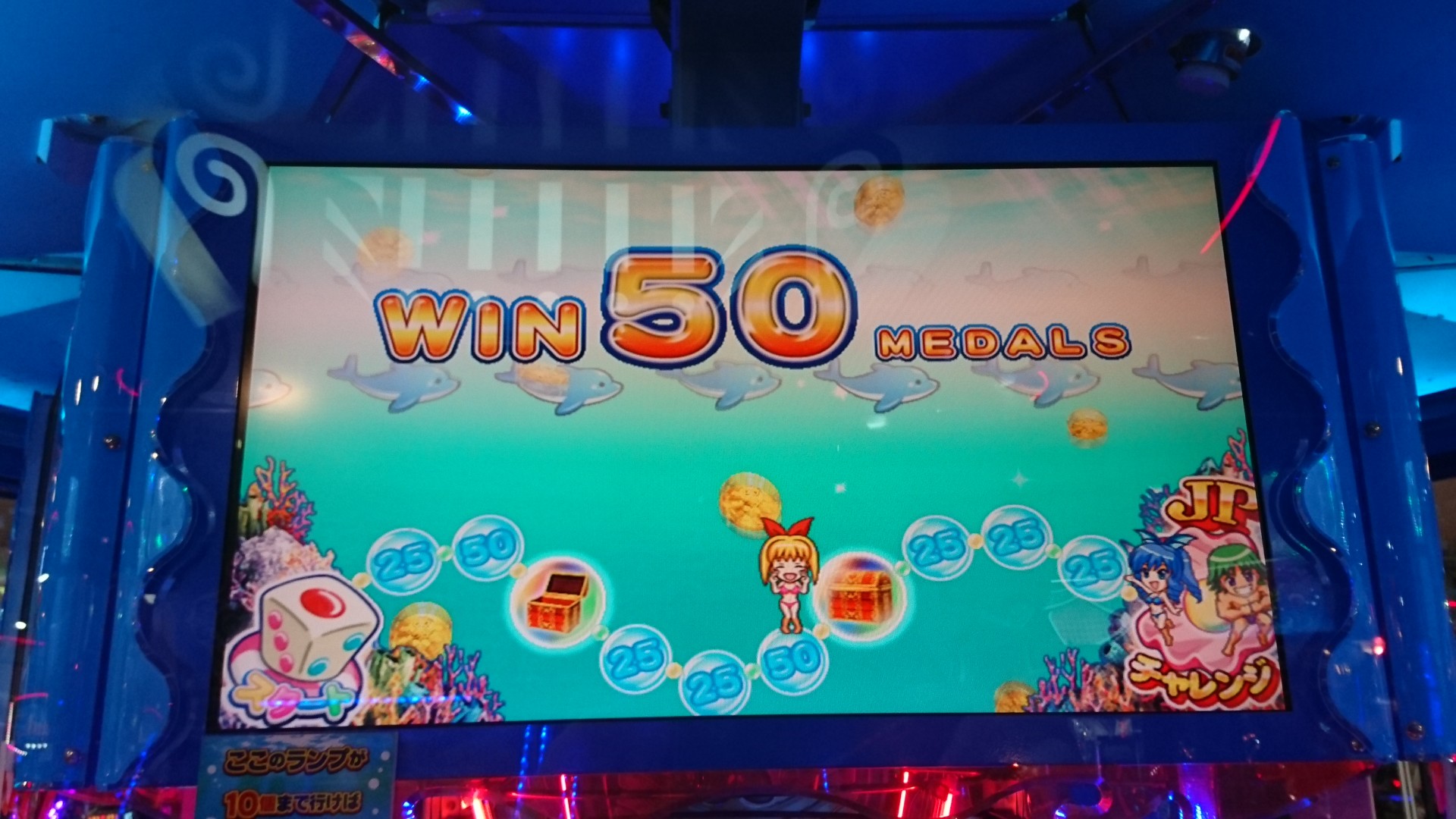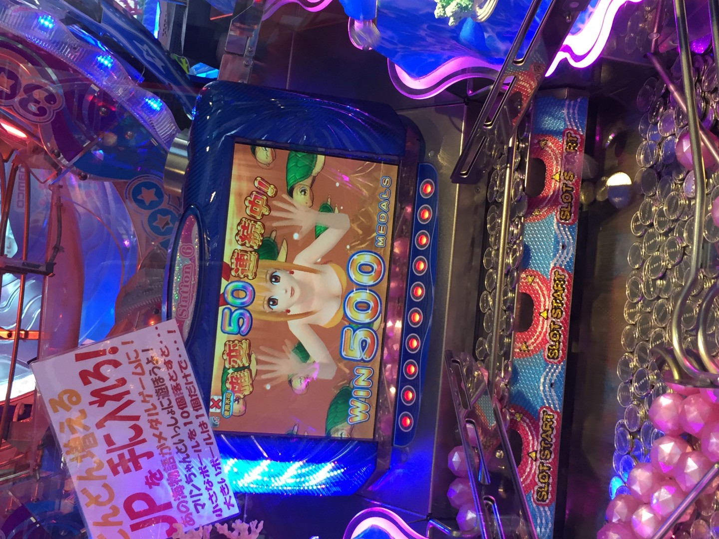 ラッキーボールが出現して落とそうと必死になって僅かなメダルを上手く使って300枚→そこからウェーブルーレットでゴールしてJPC:500枚→さらに宝箱からまさかのマリンタイム。 5回目でJPCに入って 400枚+300枚。