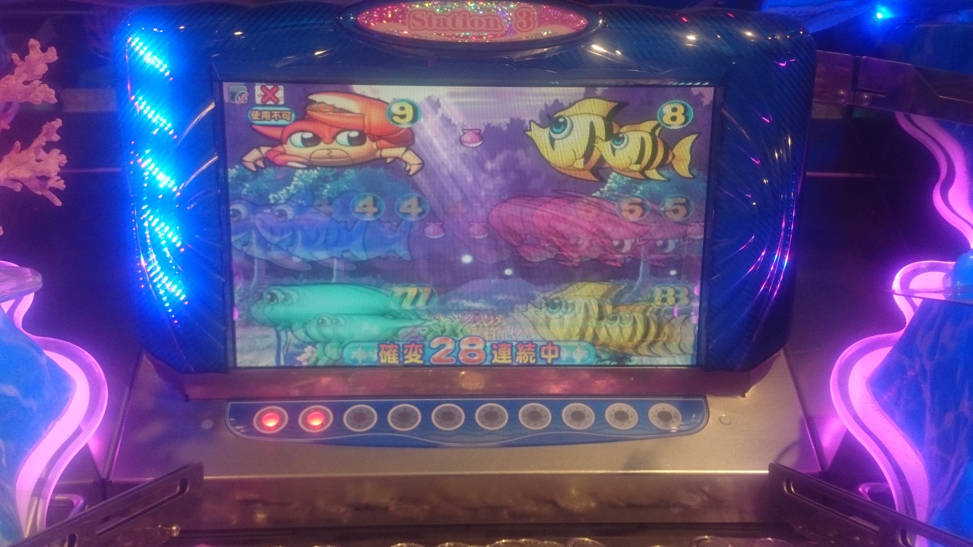 1ステ・・・メダルの落ちは良い。ラッキーボールもサクサク進む。しかし確変はほとんどこない。滅多に来ないが来たら10連くらいする。異常にカニタコに入りやすく、5連続で来たことも。しかし、故障が非常に多いのでJP狙いの常連さん以外はほとんど座っていない。。